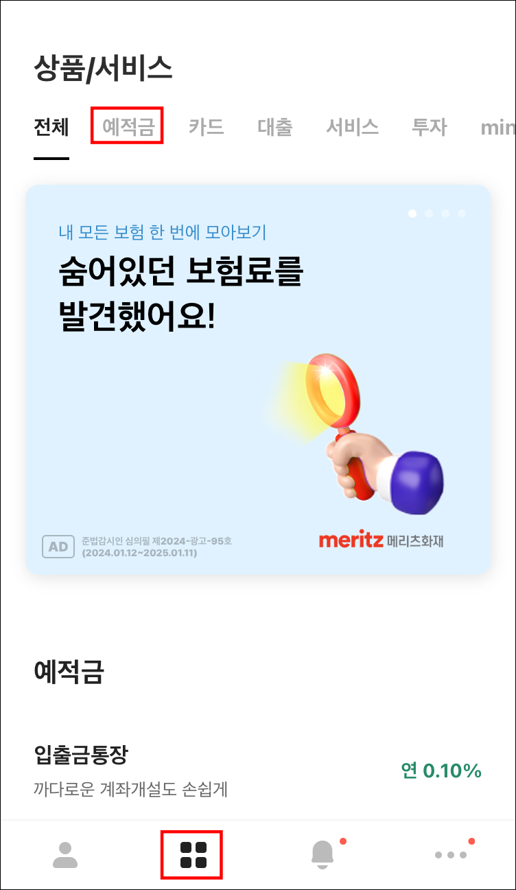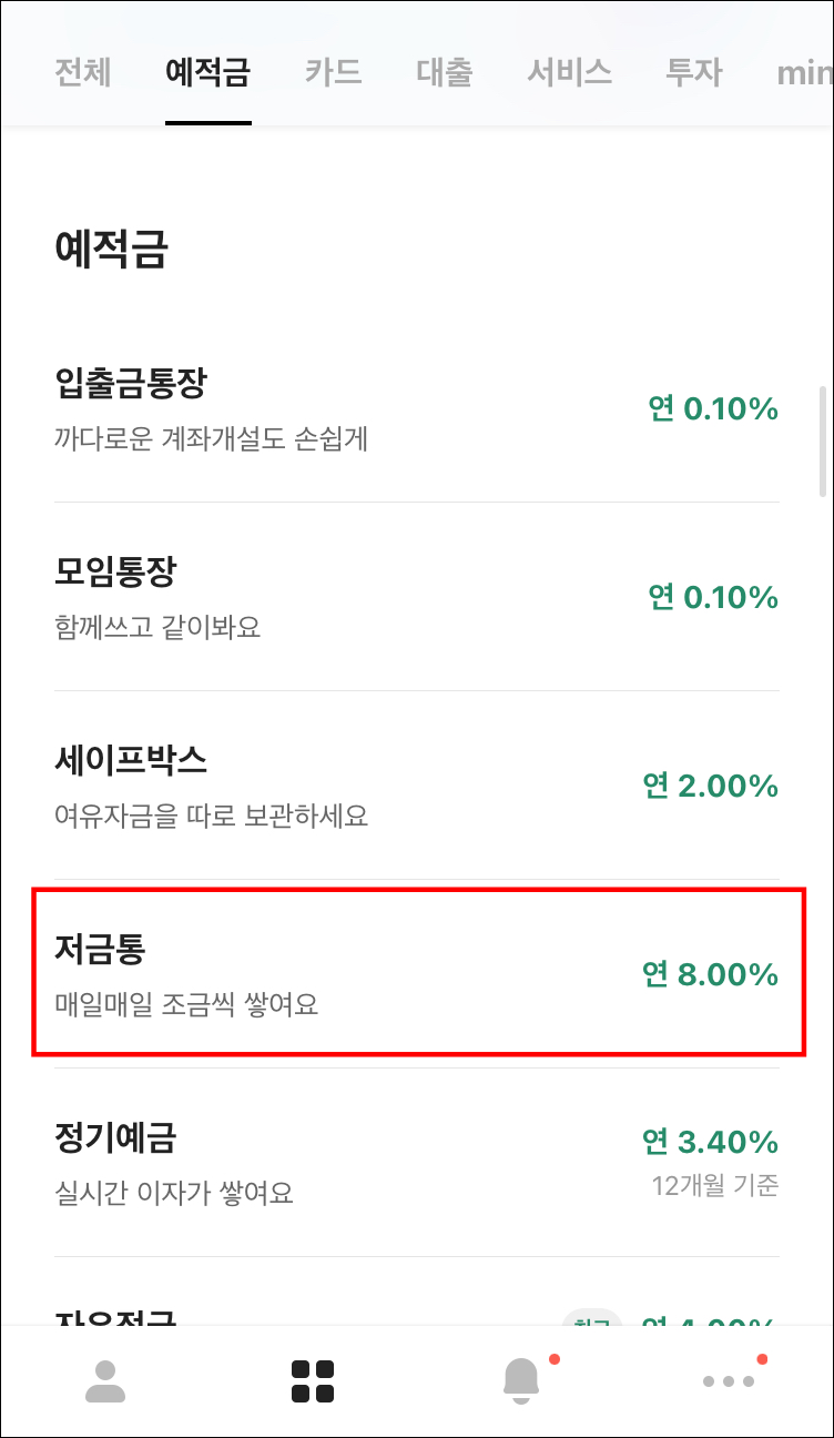 1. 카카오뱅크 메뉴에서 두 번째 메뉴를 선택합니다. 그리고 예적금을 선택합니다.